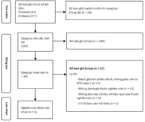 Tổng cộng 354 nghiên cứu được tìm thấy trên hai cơ sở dữ liệu (43 nghiên cứu từ Medline và 311 nghiên cứu từ Embase). Sau khi loại bỏ 26 nghiên cứu trùng lặp giữa hai cơ sở dữ liệu, 328 nghiên cứu được tiến hành rà soát tiêu đề và tóm tắt dựa trên các tiêu chí lựa chọn và loại trừ đã được xác định. Sau khi loại bỏ 298 nghiên cứu, 30 nghiên cứu tiếp tục được rà soát toàn văn.